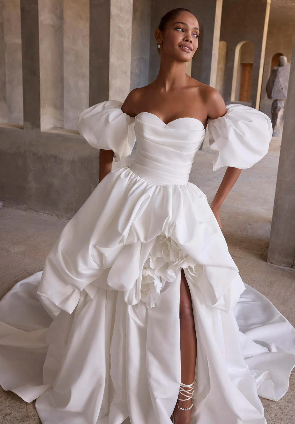 Taffeta A-line wedding dress has a strapless sweetheart, draped bodice with 3D flowers, puff sleeves, and a detachable bubble hem overskirt. Bridal gown available without the bubble hem overskirt as Style 2930D. Taffeta Bubble Hem Peplum also sold separately as Style 11627.