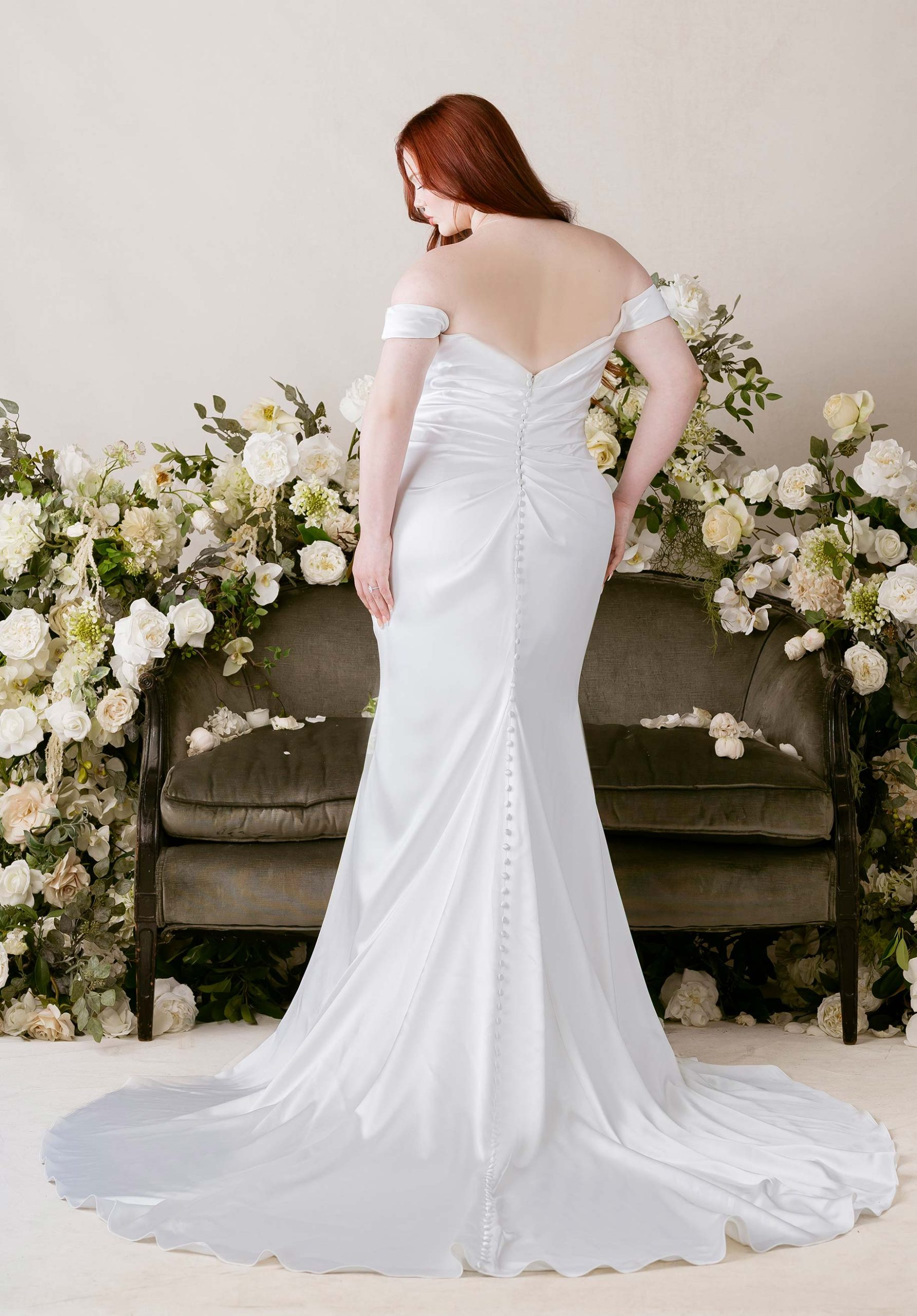 Satin fit and flare wedding dress has an off-the-shoulder sweetheart neckline on a draped bodice with a skirt slit.