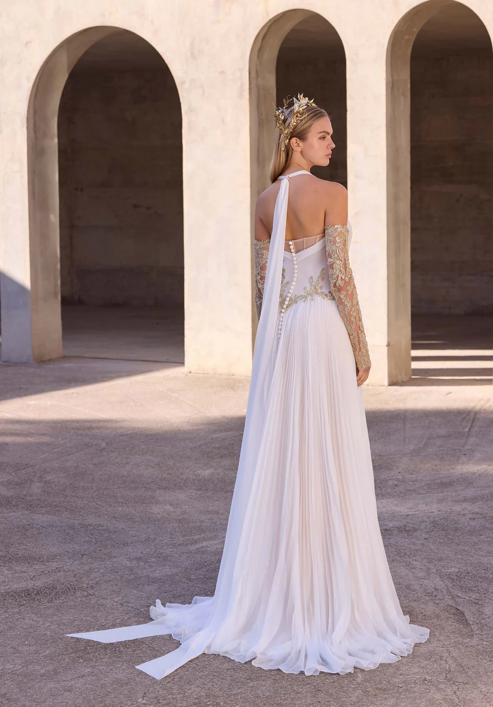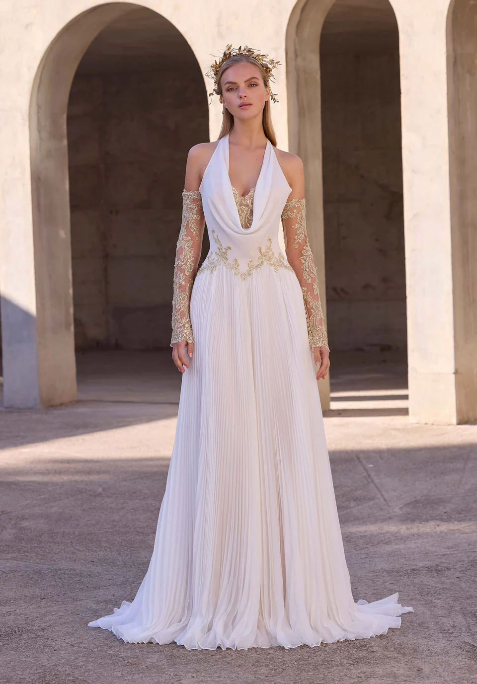 A-line wedding dress has a halter cowl neck, sweetheart corset bodice, and pleated tulle skirt with metallic lace appliqué and detachable long sleeves. Metallic Lace Scallop Long Sleeves also sold separately as Style 11622.