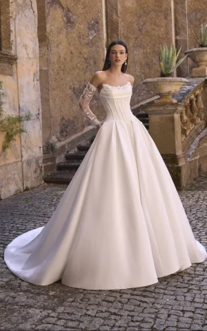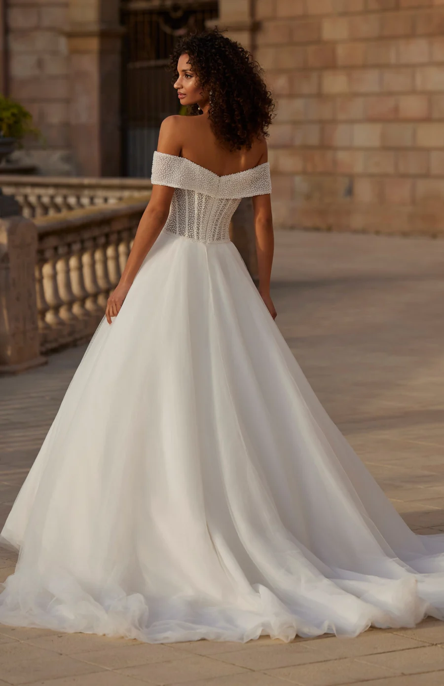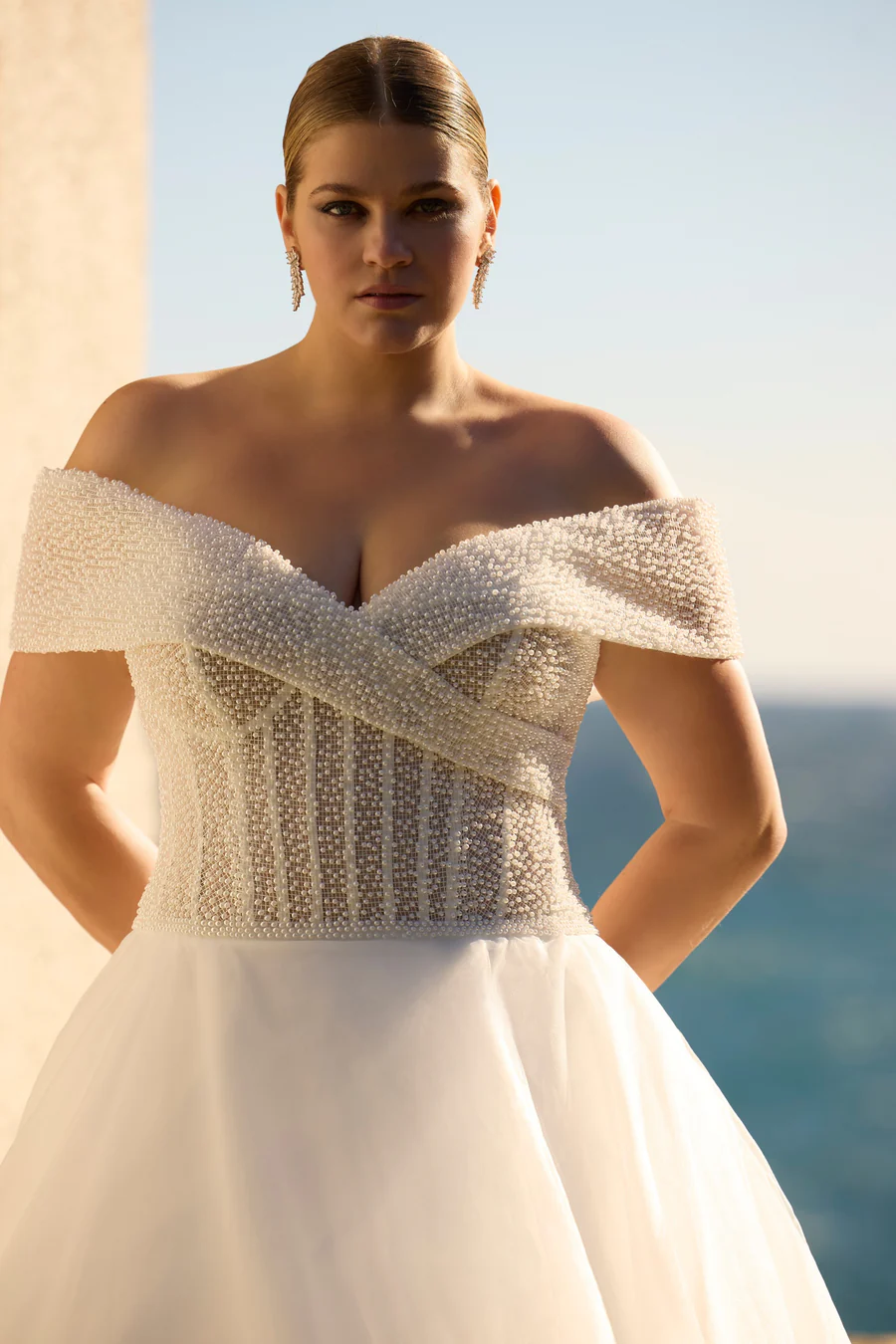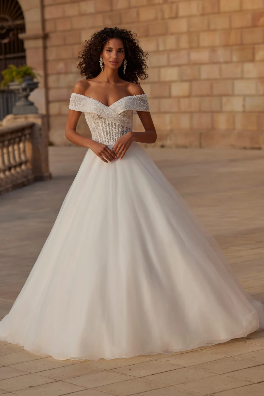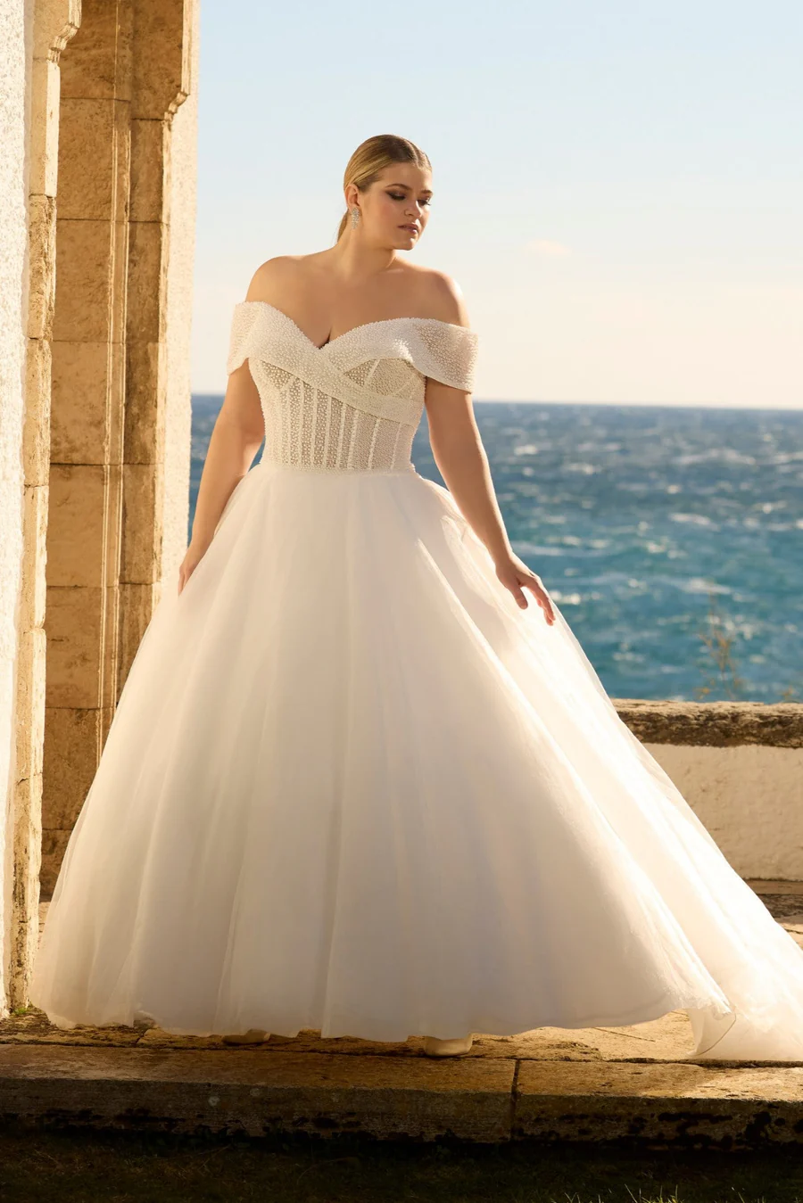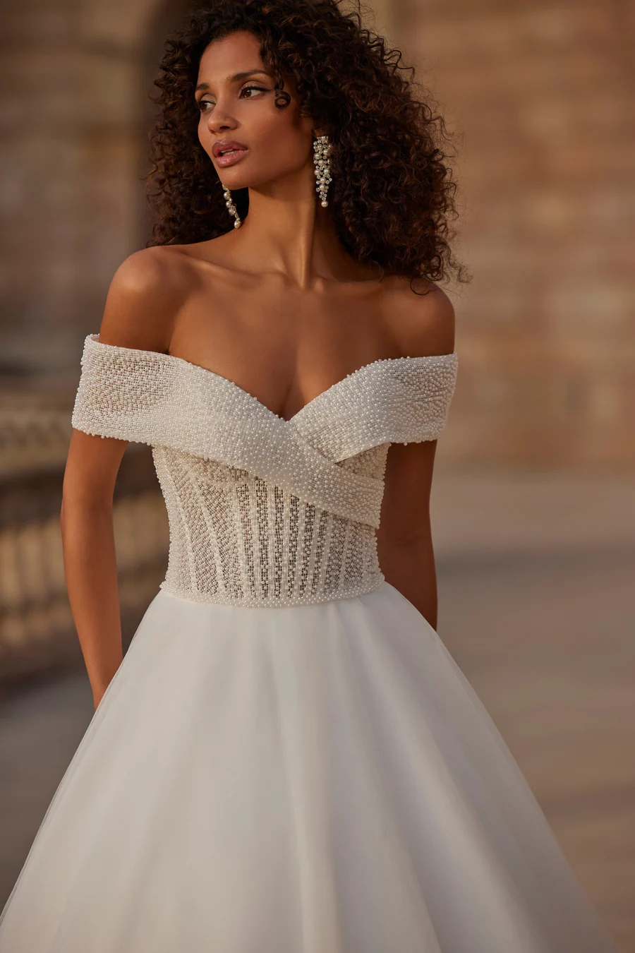 A stunning pearl princess ballgown wedding dress, showcasing an off-the-shoulder cap sleeve neckline, exposed boning on the bodice, and a voluminous organza skirt.